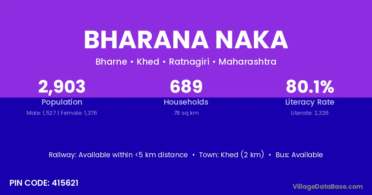 Khed (2 km) is the nearest town to Bharana Naka village for major economic activities and is located approximately 2 km away.