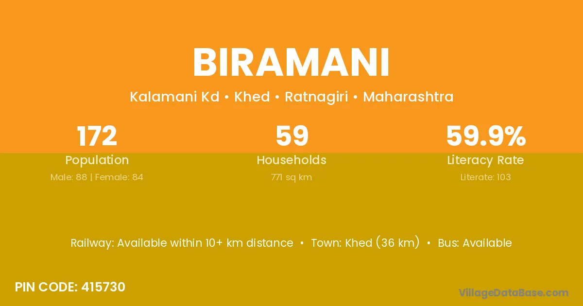 Khed (36 km) is the nearest town to Biramani village for major economic activities and is located approximately 36 km away.