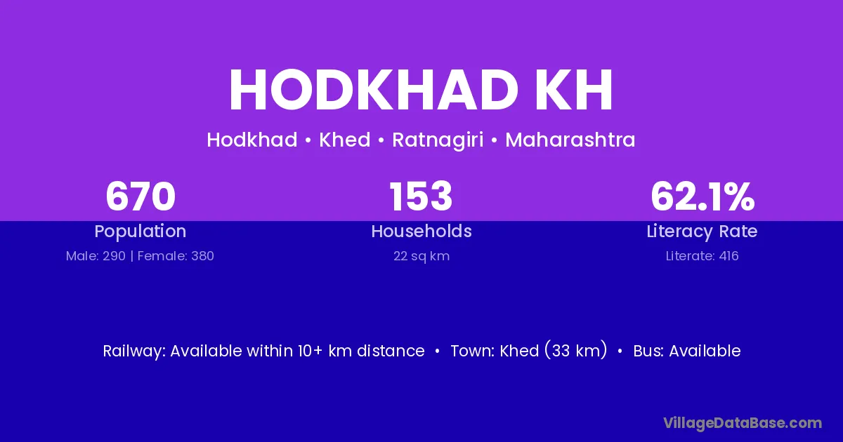 Khed (33 km) is the nearest town to Hodkhad Kh village for major economic activities and is located approximately 33 km away.