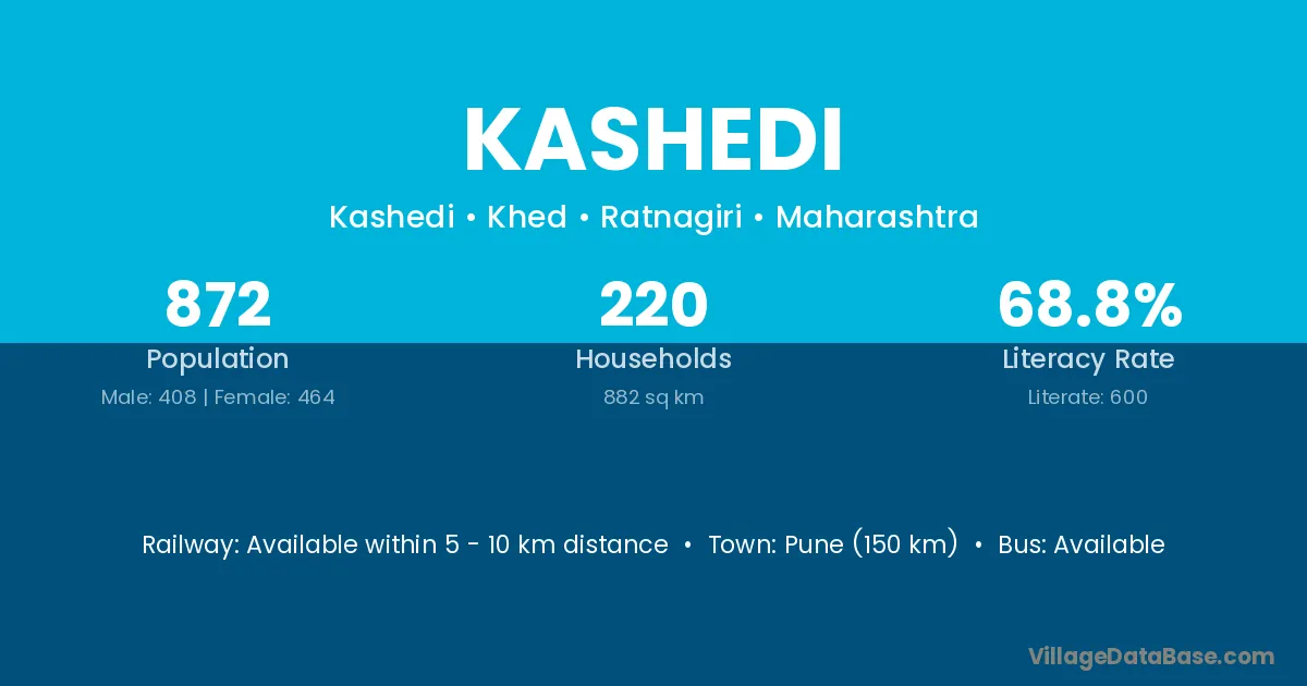 Pune (150 km) is the nearest town to Kashedi village for major economic activities and is located approximately 150 km away.