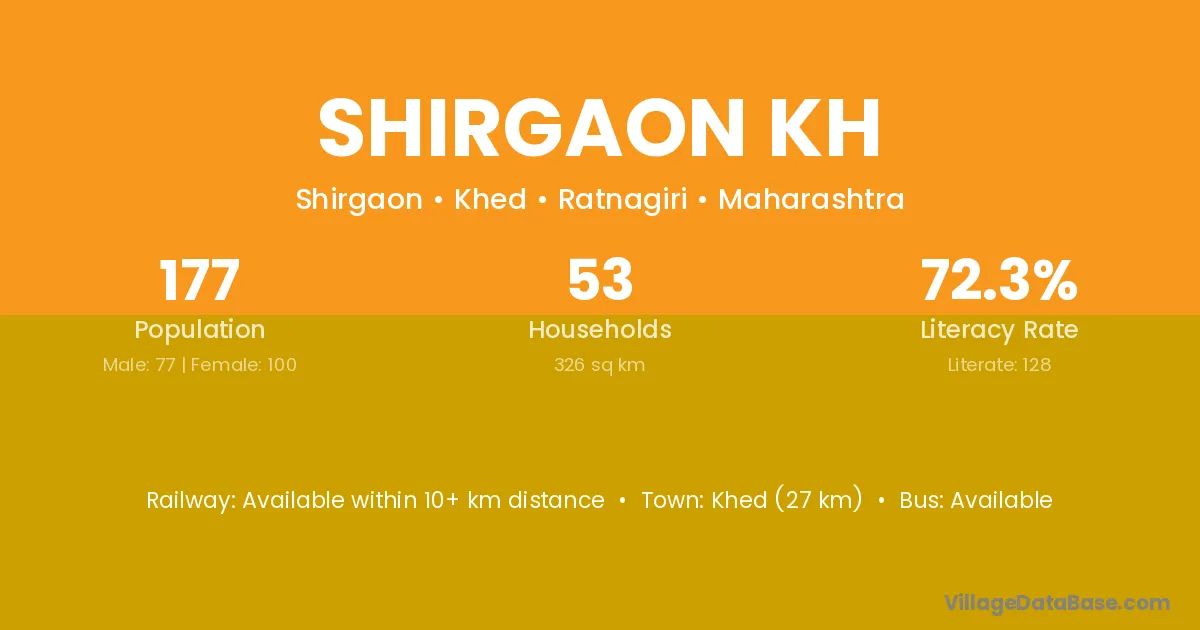 Shirgaon Kh village has a total population of 177 people, of which 77 are males and 100 are females.