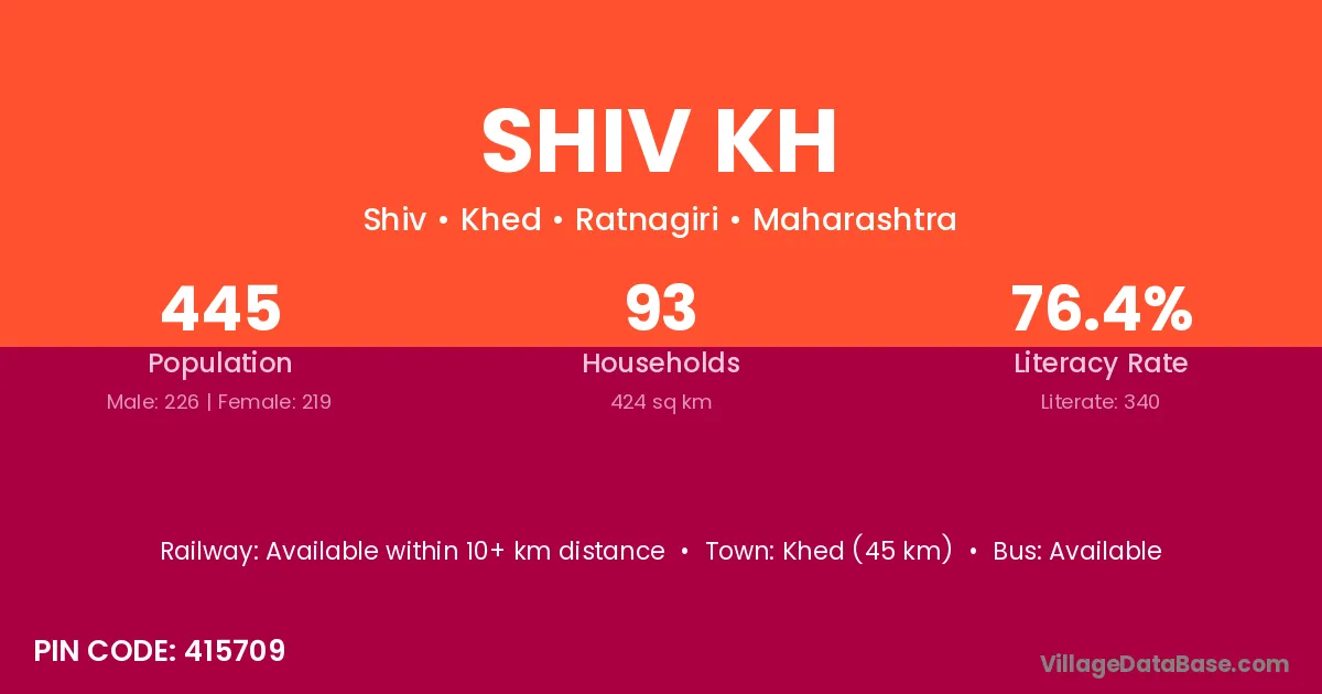 Khed (45 km) is the nearest town to Shiv Kh village for major economic activities and is located approximately 45 km away.