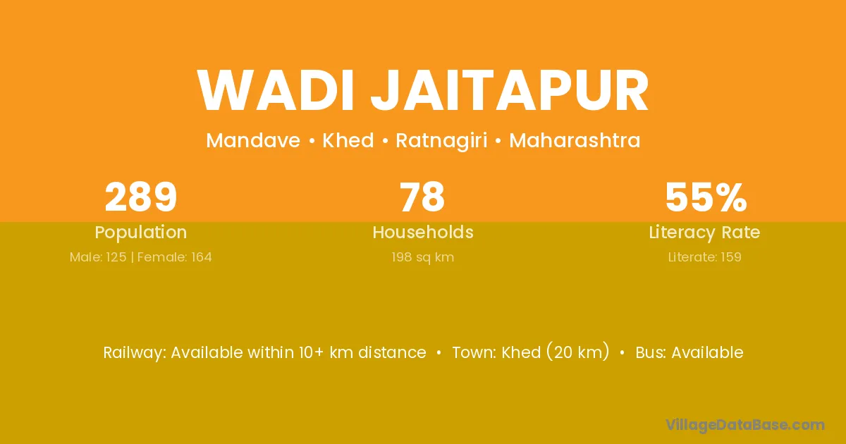 Khed (20 km) is the nearest town to Wadi Jaitapur village for major economic activities and is located approximately 20 km away.