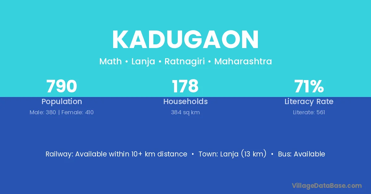 Lanja (13 km) is the nearest town to Kadugaon village for major economic activities and is located approximately 13 km away.