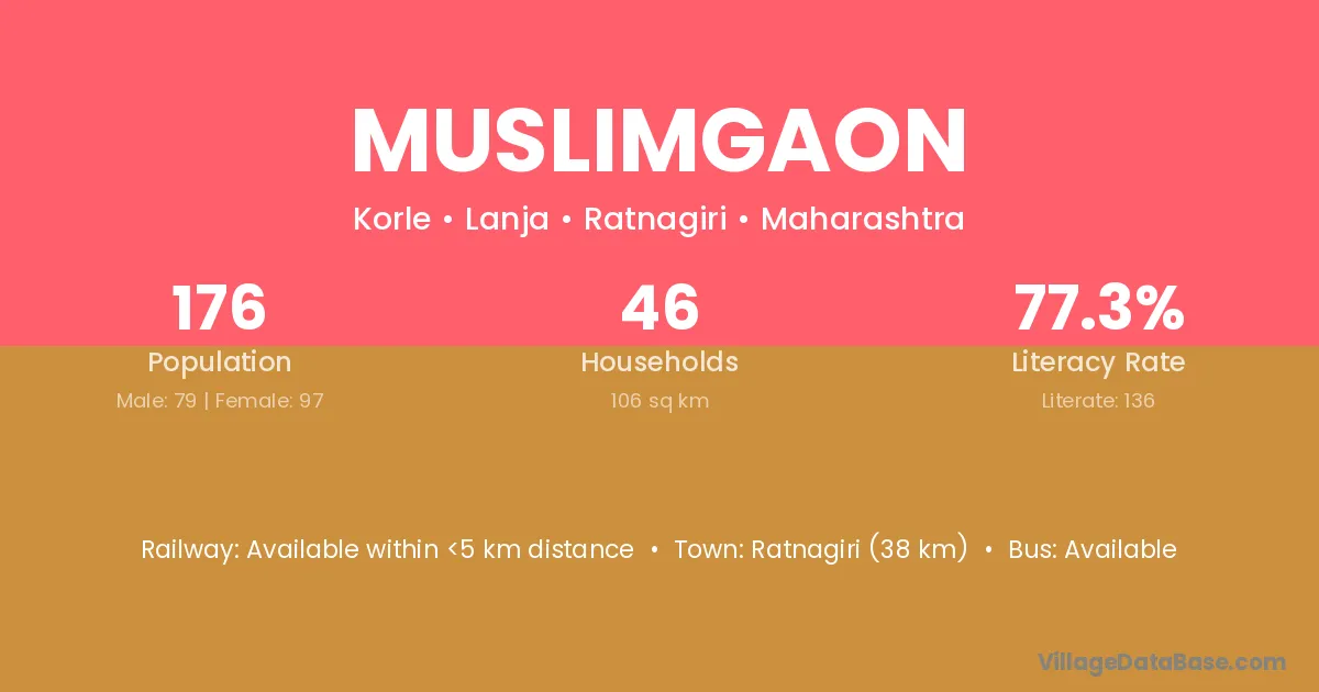 Ratnagiri (38 km) is the nearest town to Muslimgaon village for major economic activities and is located approximately 38 km away.