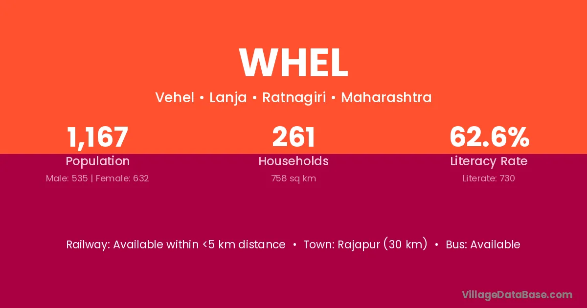 Rajapur (30 km) is the nearest town to Whel village for major economic activities and is located approximately 30 km away.