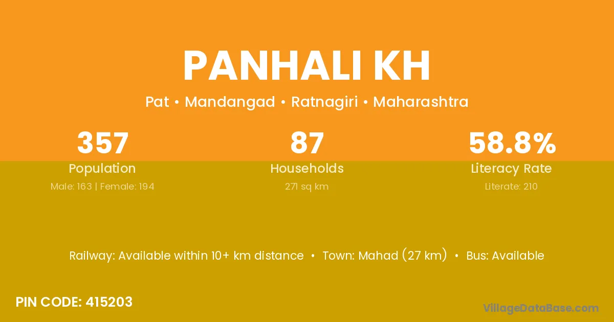 Mahad (27 km) is the nearest town to Panhali Kh village for major economic activities and is located approximately 27 km away.