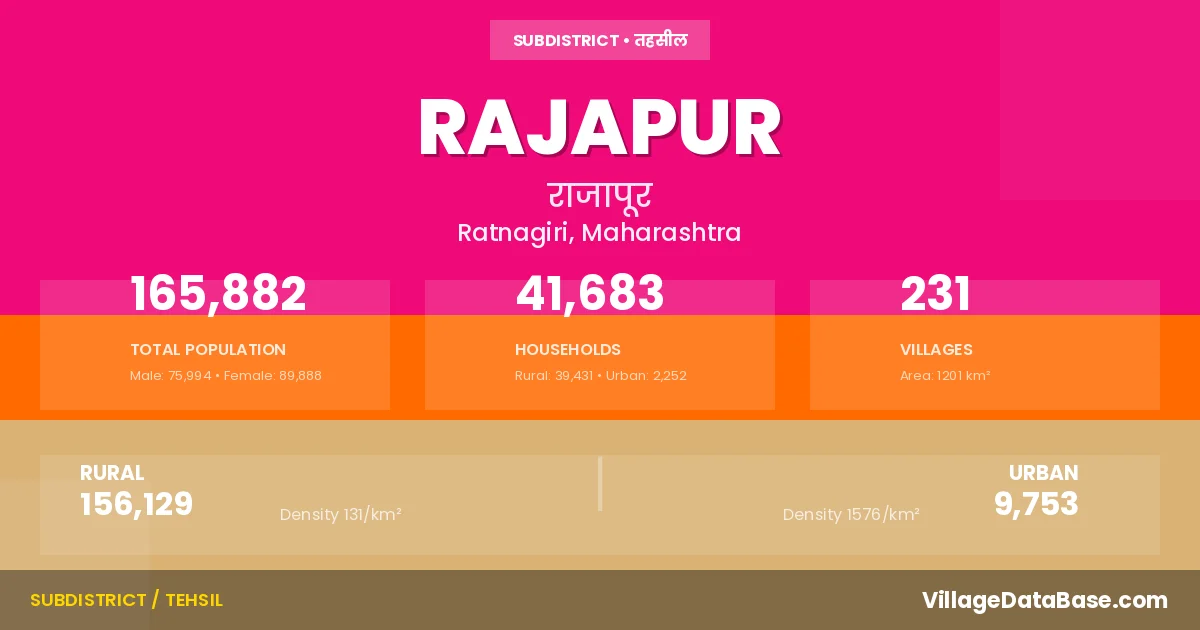 According to the 2011 census The total area of Rajapur Tehsil is 1201 km², with a population of 165882 people. The population density is 138 inhabitants per square kilometre, and there are approximately 41683 houses in the sub district.