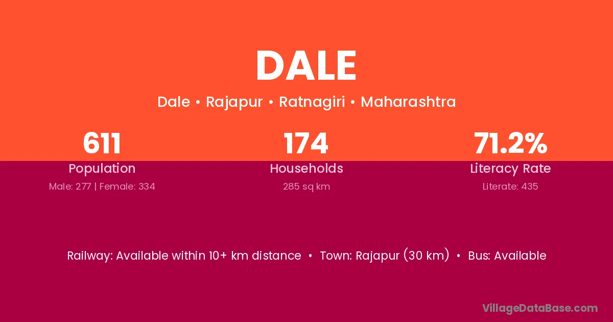 Rajapur (30 km) is the nearest town to Dale village for major economic activities and is located approximately 30 km away.