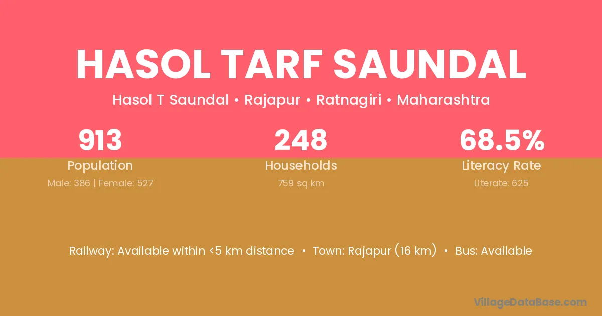 Rajapur (16 km) is the nearest town to Hasol Tarf Saundal village for major economic activities and is located approximately 16 km away.