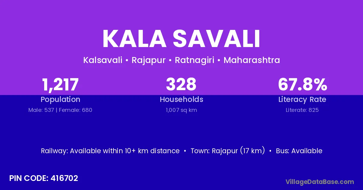 Rajapur (17 km) is the nearest town to Kala Savali village for major economic activities and is located approximately 17 km away.