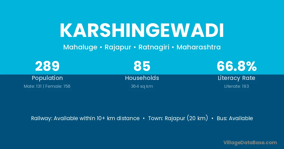 Rajapur (20 km) is the nearest town to Karshingewadi village for major economic activities and is located approximately 20 km away.