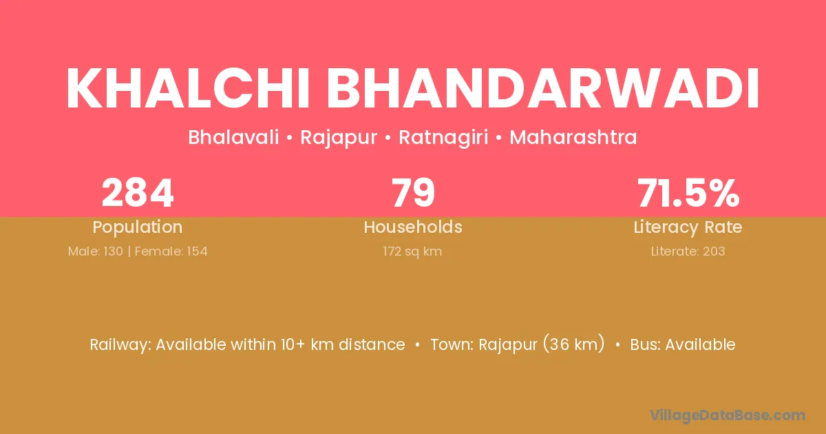 Rajapur (36 km) is the nearest town to Khalchi Bhandarwadi village for major economic activities and is located approximately 36 km away.
