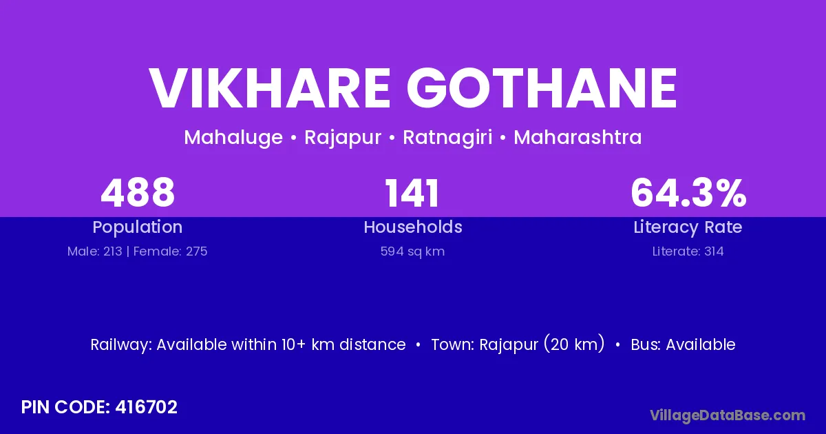 Rajapur (20 km) is the nearest town to Vikhare Gothane village for major economic activities and is located approximately 20 km away.