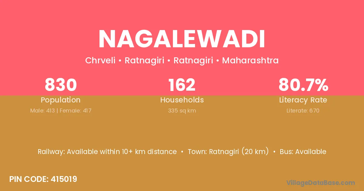 Nagalewadi village has a total population of 830 people, of which 413 are males and 417 are females.
