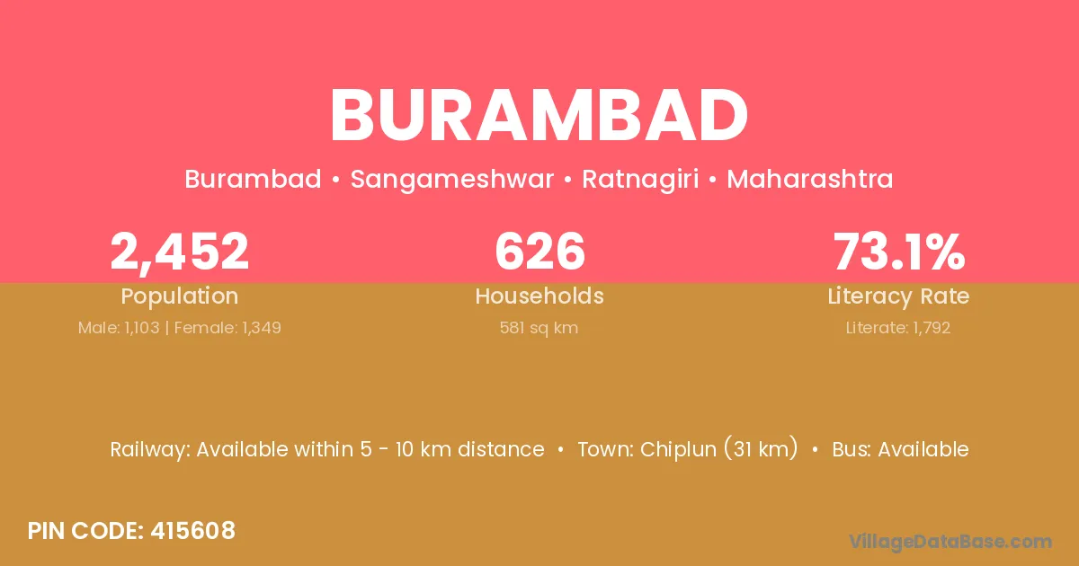 Chiplun (31 km) is the nearest town to Burambad village for major economic activities and is located approximately 31 km away.