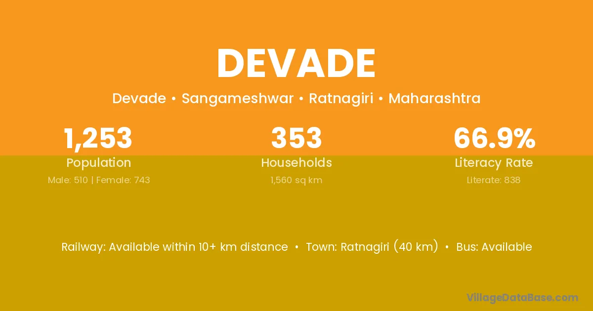 Devade village has a total population of 1,253 people, of which 510 are males and 743 are females.