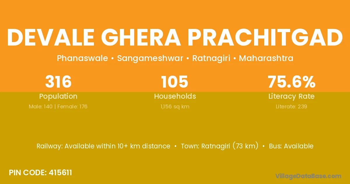 Ratnagiri (73 km) is the nearest town to Devale Ghera Prachitgad village for major economic activities and is located approximately 73 km away.