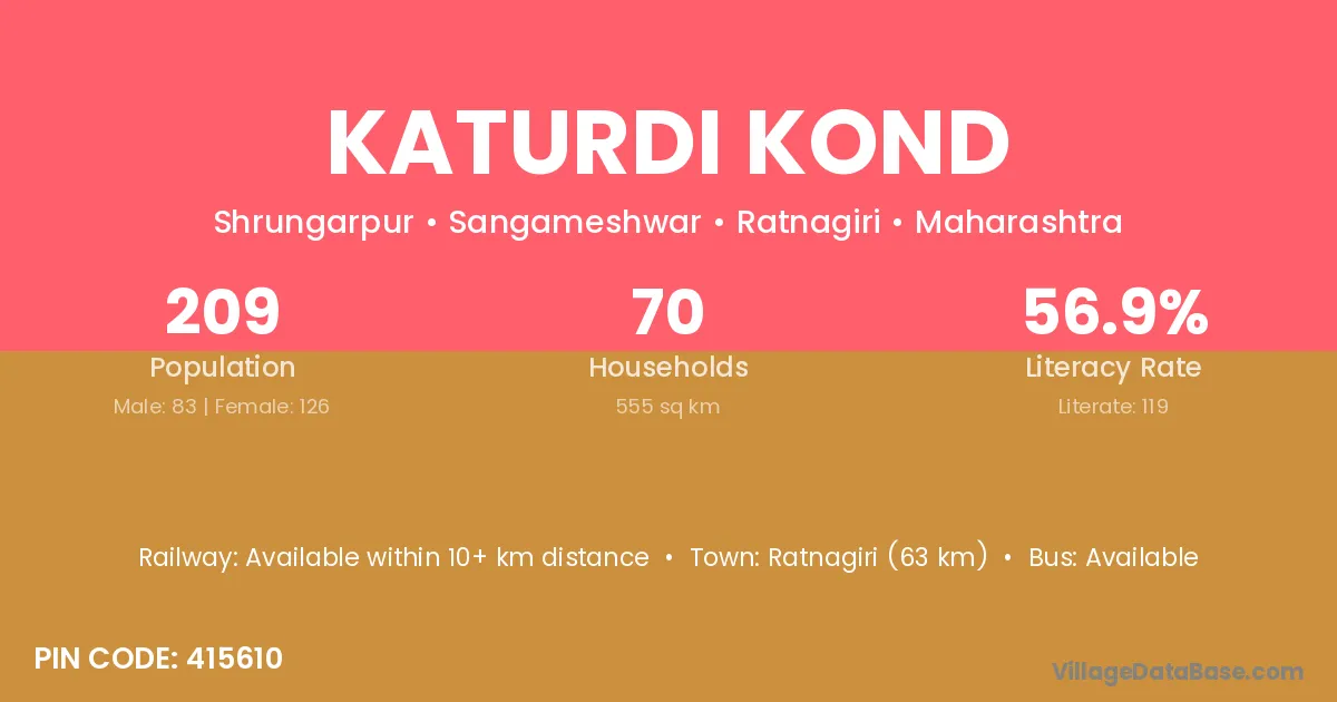 Ratnagiri (63 km) is the nearest town to Katurdi Kond village for major economic activities and is located approximately 63 km away.