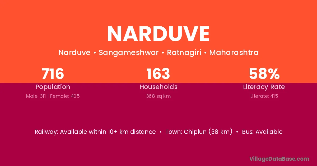 Chiplun (38 km) is the nearest town to Narduve village for major economic activities and is located approximately 38 km away.
