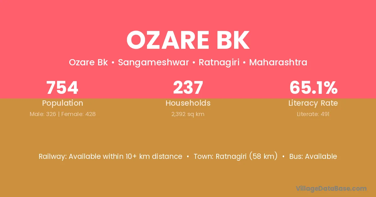 Ratnagiri (58 km) is the nearest town to Ozare Bk village for major economic activities and is located approximately 58 km away.