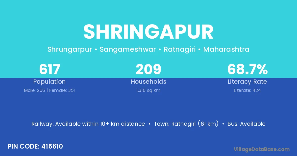 Ratnagiri (61 km) is the nearest town to Shringapur village for major economic activities and is located approximately 61 km away.