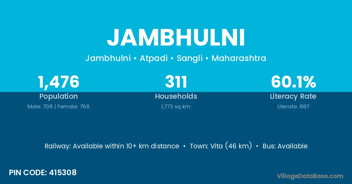 Vita (46 km) is the nearest town to Jambhulni village for major economic activities and is located approximately 46 km away.