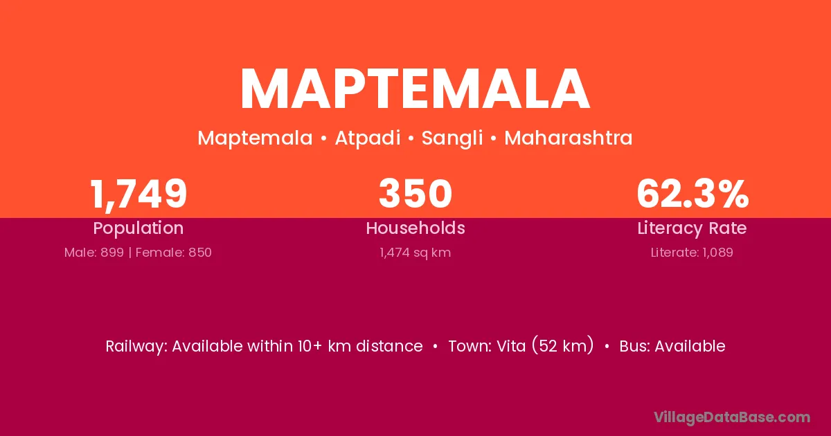 Vita (52 km) is the nearest town to Maptemala village for major economic activities and is located approximately 52 km away.
