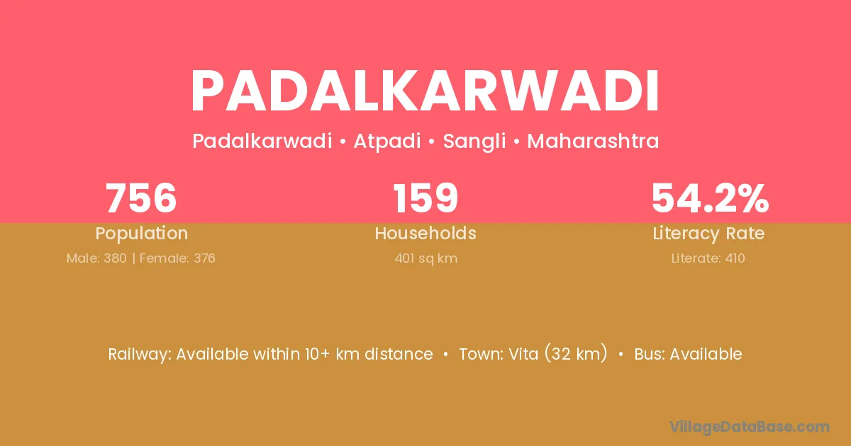 Vita (32 km) is the nearest town to Padalkarwadi village for major economic activities and is located approximately 32 km away.