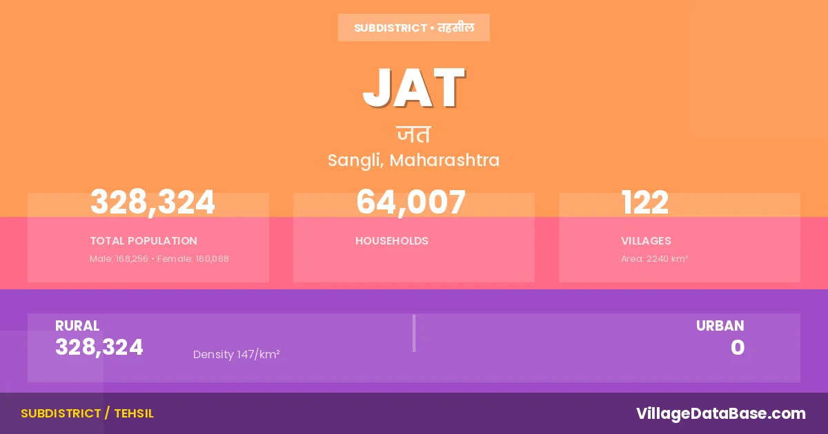 According to the 2011 census The total area of Jat Tehsil is 2240 km², with a population of 328324 people. The population density is 147 inhabitants per square kilometre, and there are approximately 64007 houses in the sub district.