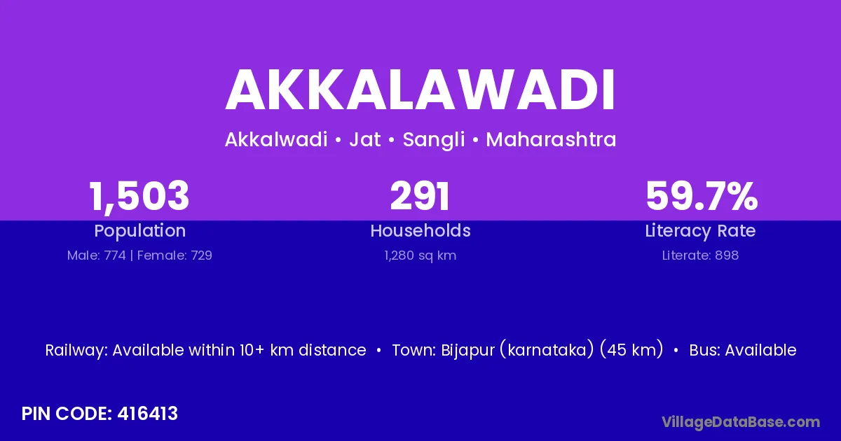 Akkalawadi village has a total population of 1,503 people, of which 774 are males and 729 are females.