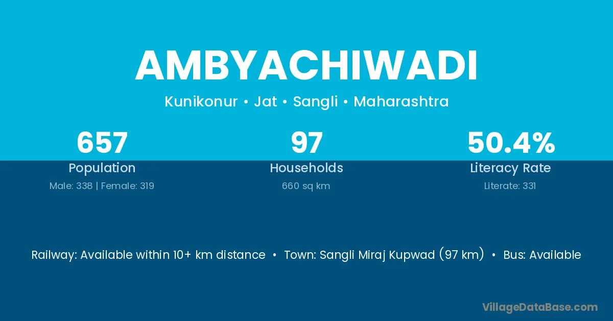 Ambyachiwadi village has a total population of 657 people, of which 338 are males and 319 are females.