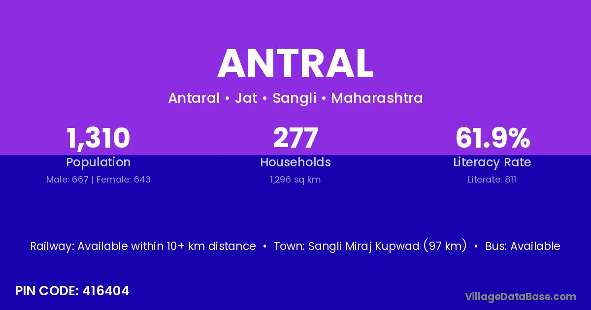 Sangli Miraj Kupwad (97 km) is the nearest town to Antral village for major economic activities and is located approximately 97 km away.