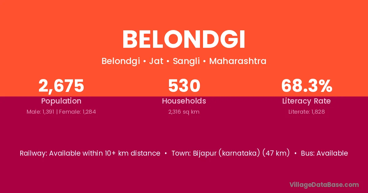 Bijapur (karnataka) (47 km) is the nearest town to Belondgi village for major economic activities and is located approximately 47 km away.