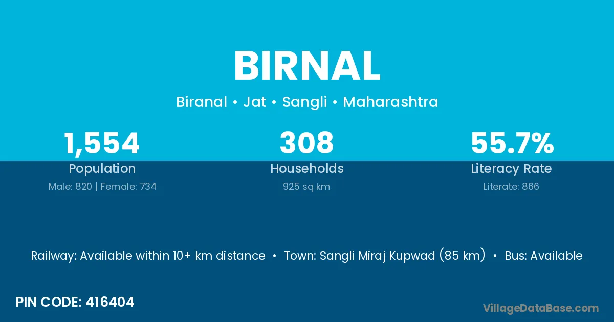 Sangli Miraj Kupwad (85 km) is the nearest town to Birnal village for major economic activities and is located approximately 85 km away.