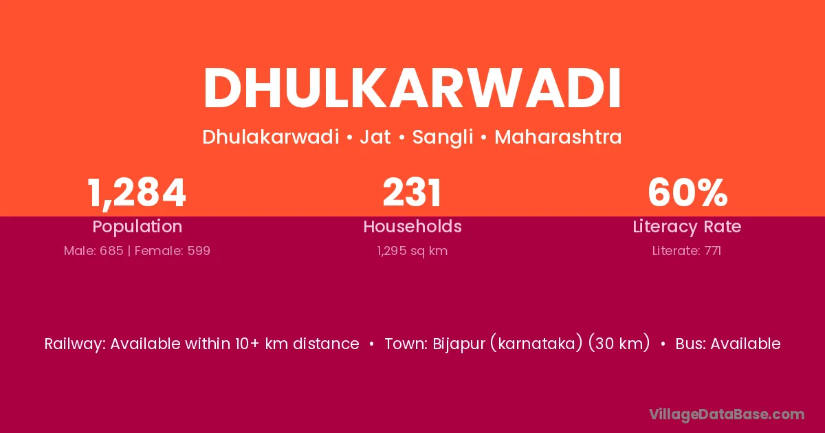 Bijapur (karnataka) (30 km) is the nearest town to Dhulkarwadi village for major economic activities and is located approximately 30 km away.