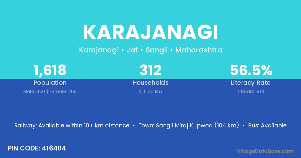 Sangli Miraj Kupwad (104 km) is the nearest town to Karajanagi village for major economic activities and is located approximately 104 km away.