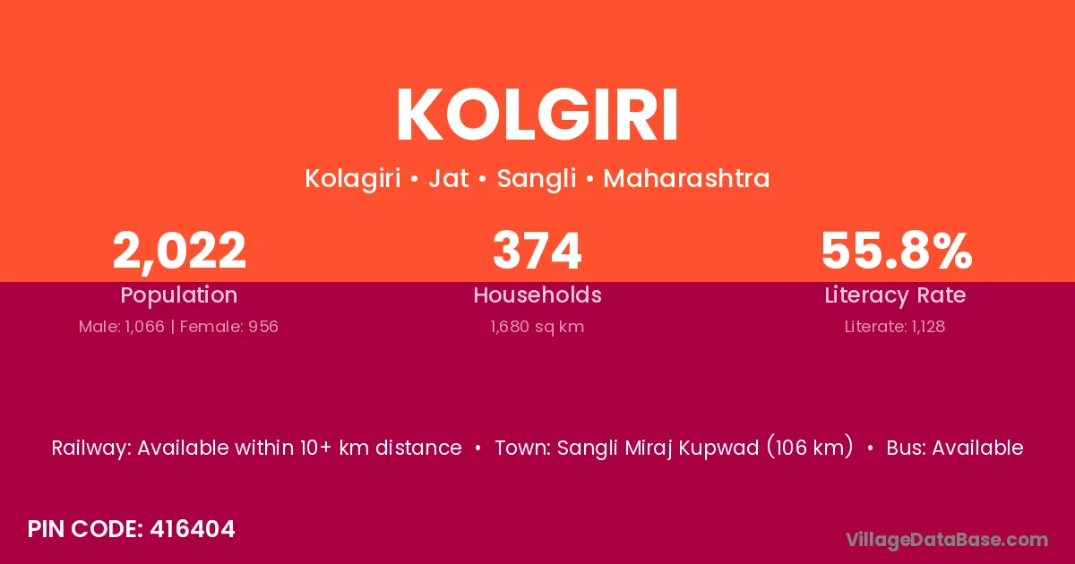 Sangli Miraj Kupwad (106 km) is the nearest town to Kolgiri village for major economic activities and is located approximately 106 km away.