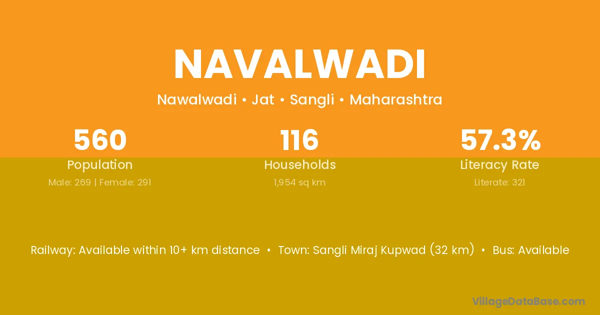 Sangli Miraj Kupwad (32 km) is the nearest town to Navalwadi village for major economic activities and is located approximately 32 km away.