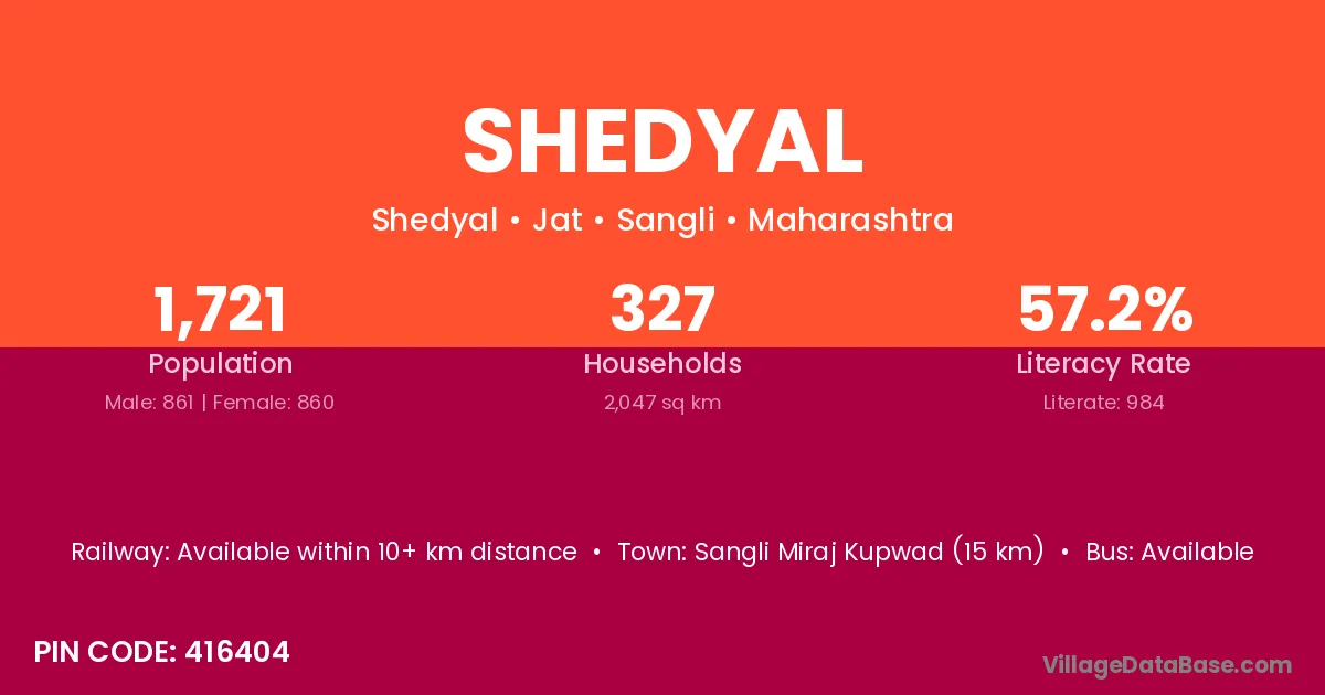 Sangli Miraj Kupwad (15 km) is the nearest town to Shedyal village for major economic activities and is located approximately 15 km away.