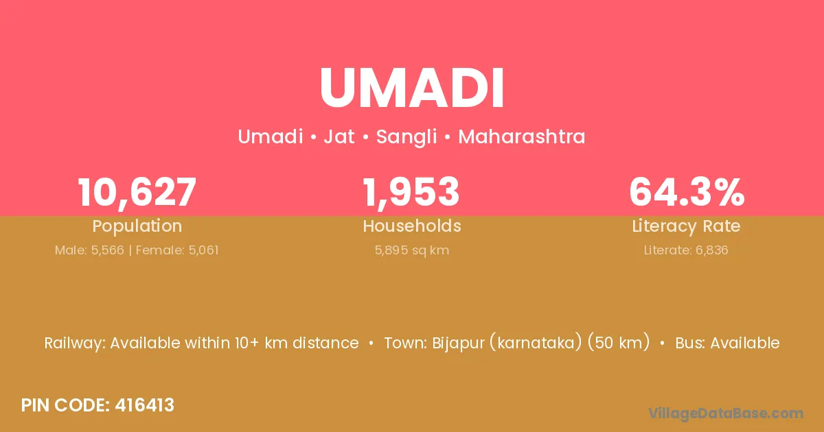 Umadi village has a total population of 10,627 people, of which 5,566 are males and 5,061 are females.