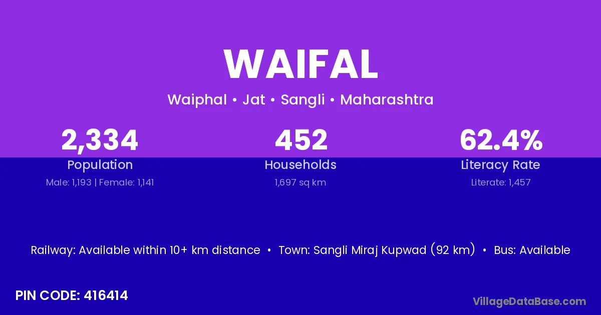 Sangli Miraj Kupwad (92 km) is the nearest town to Waifal village for major economic activities and is located approximately 92 km away.