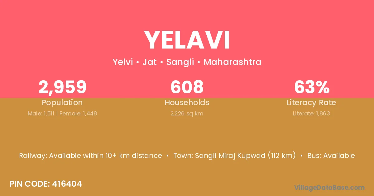 Sangli Miraj Kupwad (112 km) is the nearest town to Yelavi village for major economic activities and is located approximately 112 km away.