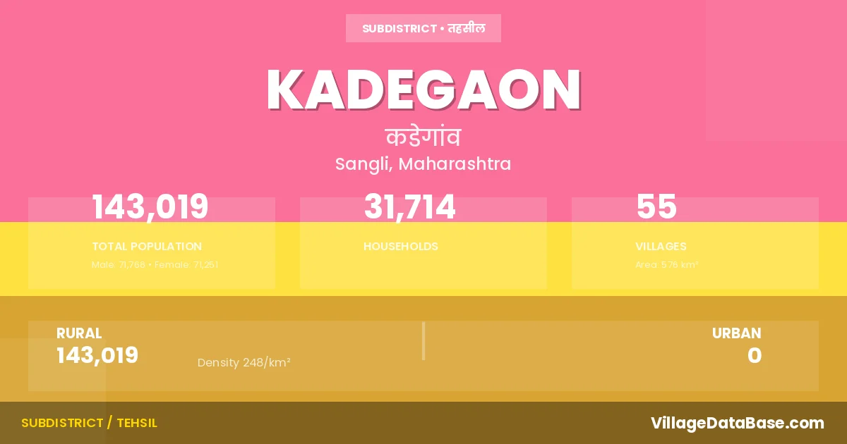 According to the 2011 census The total area of Kadegaon Tehsil is 576 km², with a population of 143019 people. The population density is 248 inhabitants per square kilometre, and there are approximately 31714 houses in the sub district.