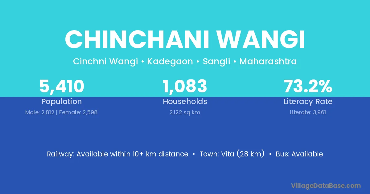 Vita (28 km) is the nearest town to Chinchani Wangi village for major economic activities and is located approximately 28 km away.