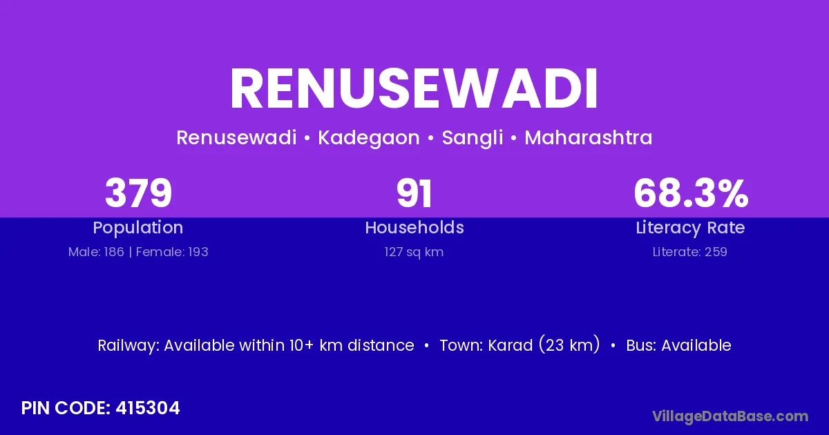 Renusewadi village has a total population of 379 people, of which 186 are males and 193 are females.