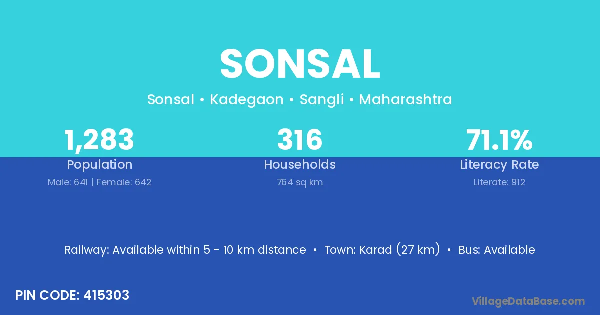 Karad (27 km) is the nearest town to Sonsal village for major economic activities and is located approximately 27 km away.