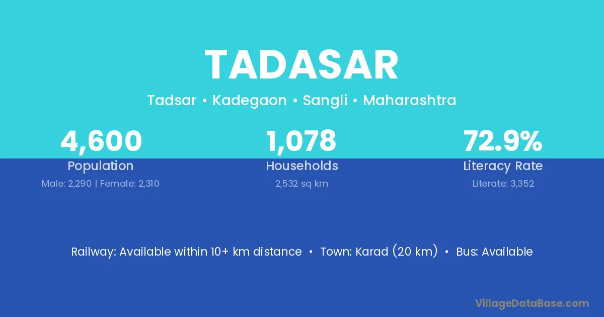Karad (20 km) is the nearest town to Tadasar village for major economic activities and is located approximately 20 km away.