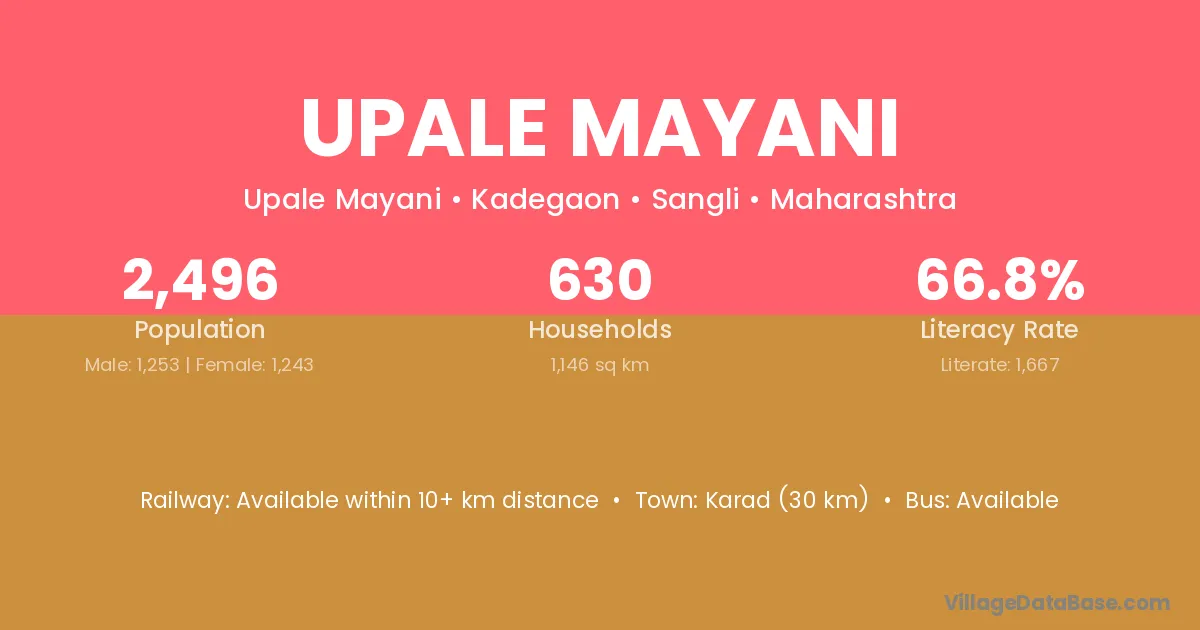 Karad (30 km) is the nearest town to Upale Mayani village for major economic activities and is located approximately 30 km away.