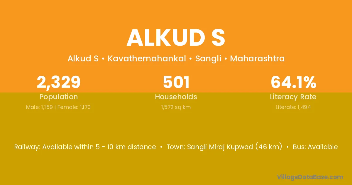 Sangli Miraj Kupwad (46 km) is the nearest town to Alkud S village for major economic activities and is located approximately 46 km away.